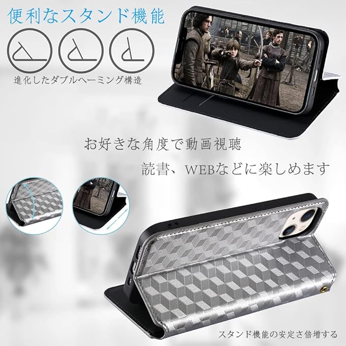 【スタンド機能&カード収納】自由に調整できる横置きスタンド機能が付き、動画視聴を思う存分楽しめます。カードレシートや名刺など、丈夫で安全な折り畳み式携帯電話ケースを収納できます。マグネットは電話ケースの側面に内蔵されており、カードに直接触れないため、磁気カードの損傷を心配する必要はありません。精密なデザインで、装着状態でも電源ボタン、音量ボタン、コネクター等が問題なく利用できます。