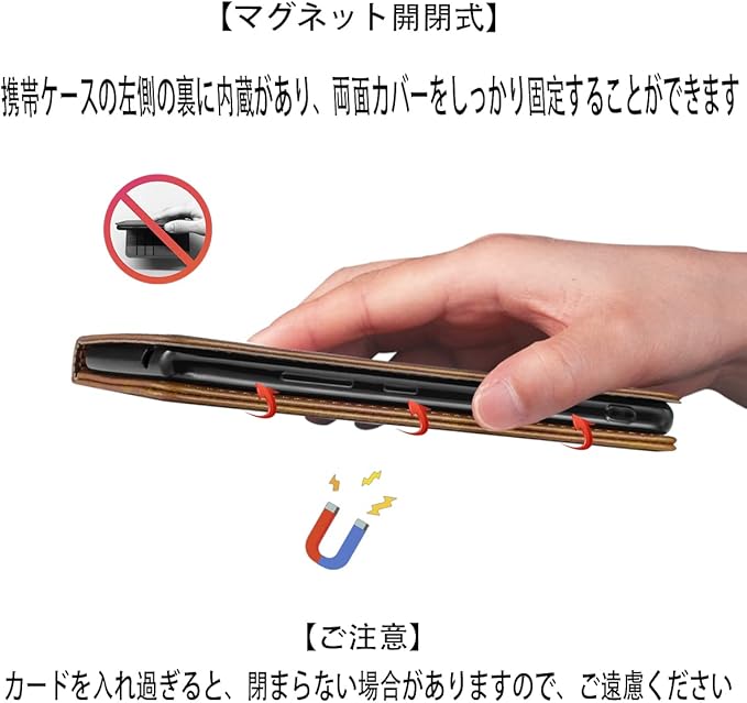 【カードポケット付き】:財布型ケースとして、名刺やお札などを入れるカードポケットがつき、ちょっとしたお出かけにもスマホケース一つでOK!日常生活に便利です。ただし、カードを入れ過ぎると、閉まらない場合がありますので、ご遠慮ください。