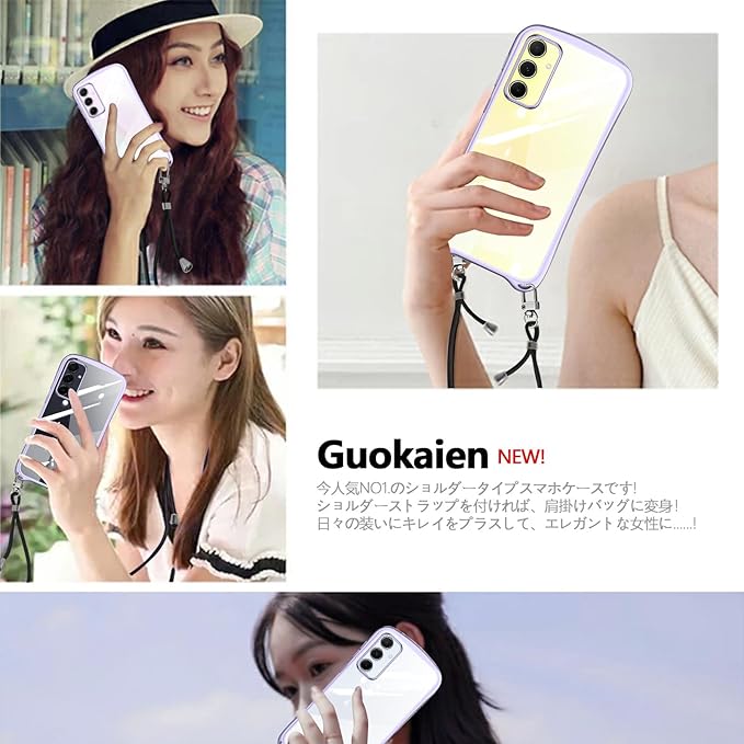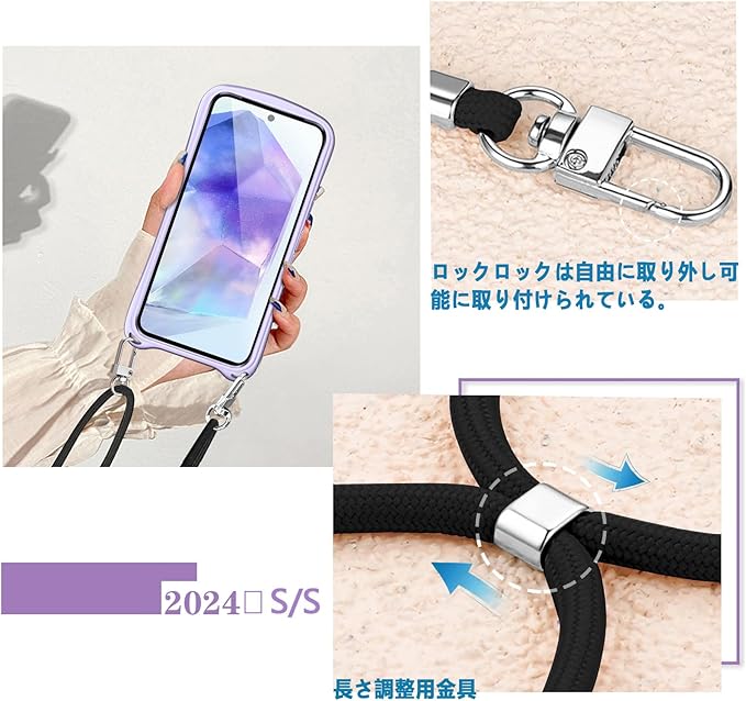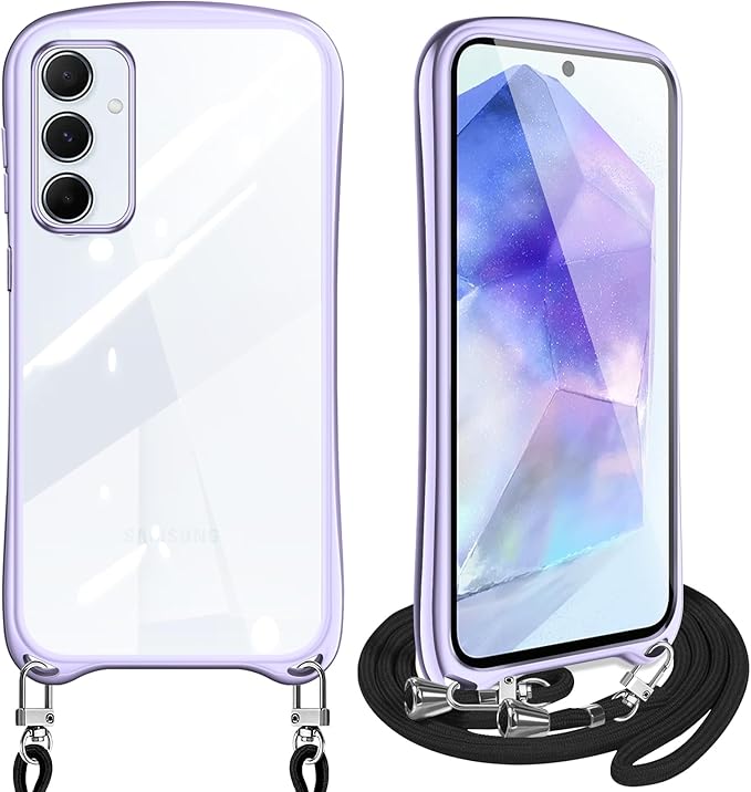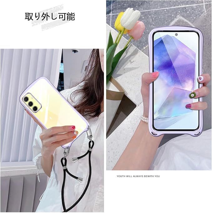 Galaxy A55 5G ケース ショルダー クリア ギャラクシーA55 カバー スマホケース 耐衝撃 透明 TPU ストラップ付き 肩掛け 首掛け 紐付き 斜めがけ シリコン メッキ加工 取り外し可能 長さ調整可能(ライトパープル)