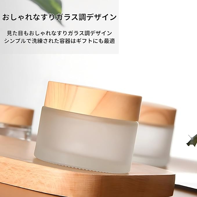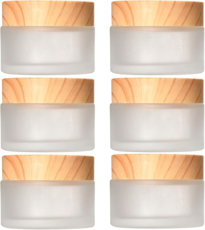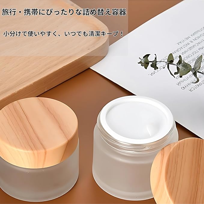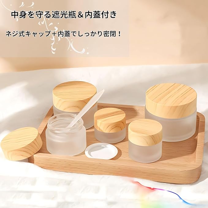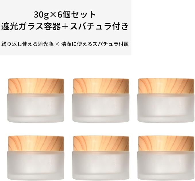 Riblind クリーム容器 30g 遮光ガラス瓶 6個セット スパチュラ付き 詰め替え容器 小分け 携帯用 旅行 ハンドクリーム アロマバーム保存 おしゃれ 木目調
