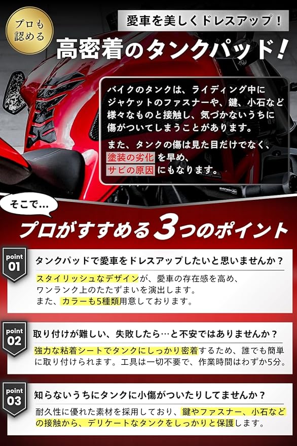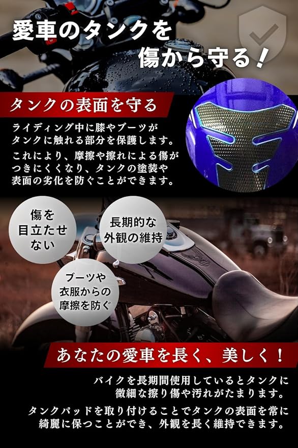 【愛車を傷から守る必需品!】 ジャケットのファスナーやベルトのバックルが擦れて付く厄介なタンクの傷をしっかりガード!大切なバイクの輝きを長く保ち、見た目の劣化を防ぎます。もう傷を気にして乗る必要はありません。