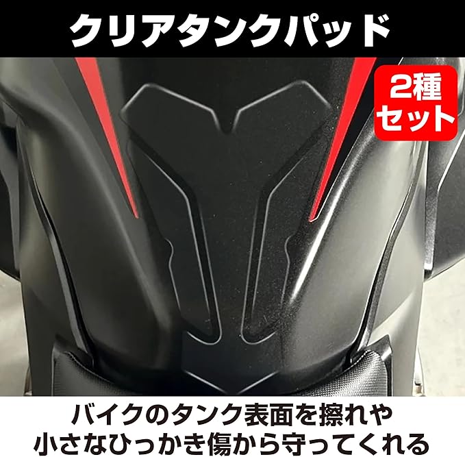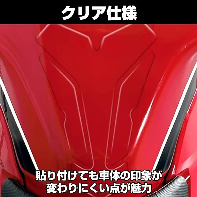 見た目を損ねず傷をガード:バイクのタンク表面を擦れや小さなひっかき傷から守ってくれるタンクパッドです。特に新車のうちに貼り付けておくことで、タンクの状態を長くきれいに保てます。クリア仕様なので、貼り付けても車体の印象が変わりにくい点が魅力です。