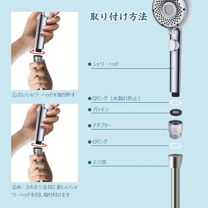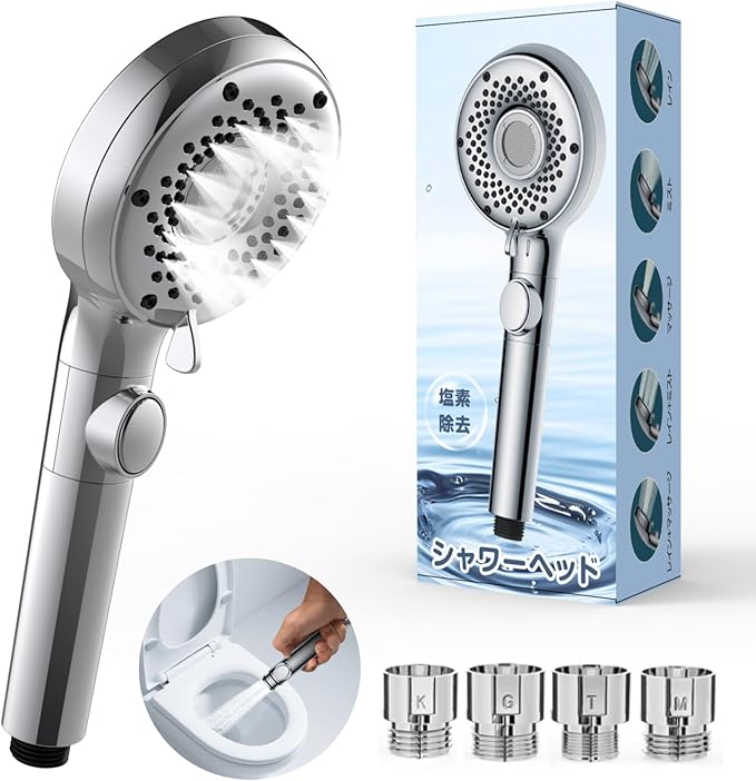 【簡単な取付&高互換性】道具不要で簡単な取付。国際汎用基準でM(MYM)・K(KVK)・G(東京ガスINAX)・T(TOTO一部)の4種類アダプターも付属され、ほとんどのシャワー設備に取り付け可能です。