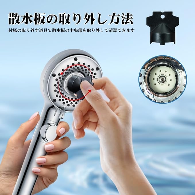 【塩素除去フィルター】肌が弱い方には塩素除去タイプのシャワーヘッドの導入をおすすめ、従来品に使われたPP綿とは異なり、本体は亜硫酸カルシウムが含まれたカートリッジを内蔵し、水中に残留した重金属、水道の老朽化による不純物などをきちんと濾過できた上、水道水に含まれる塩素を90%以上カットできて肌の乾燥や痒みを解消、髪への負担を軽減します。肌トラブルが気になる方やアトピー肌の方にも安心してご使用いただき、全身の潤いを保ちます。▶ご注意:3ヶ月ほどカートリッジ交換が必要です。