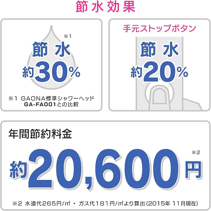 ・従来型シャワーヘッドと比べて約30%の節水効果(同メーカー比)、毎日の生活で節水を意識せずに節約できる