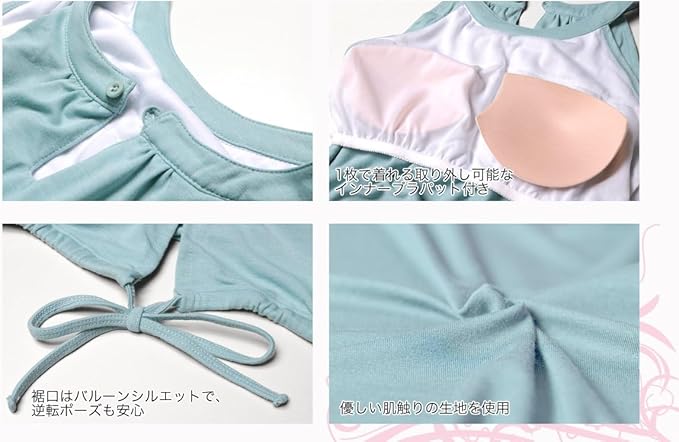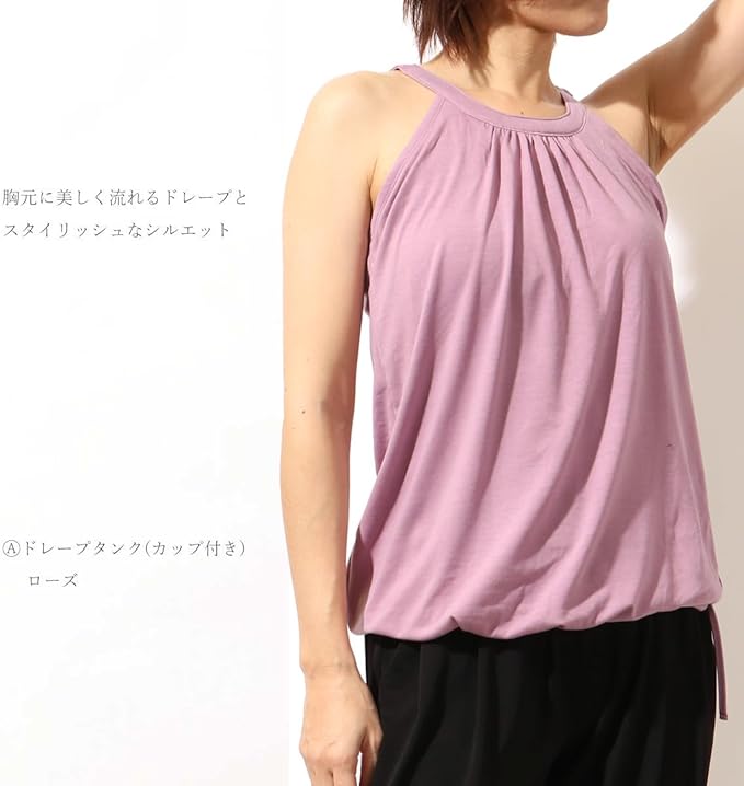 胸元に流れるドレープはまさにスポーツのおしゃれ革命! 今までにないスタイリッシュなシルエット。 屈んでも中がみえない肩美人のネックライン。 逆転ポーズも安心バルーンシルエット。 1枚で着れる取り外し可能なインナーブラパット付。