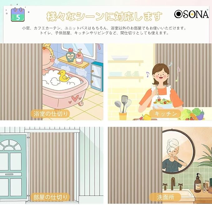 【軽やかに空間を分ける階段やお部屋の間仕切りに】✎小窓、カフエカ一テン、ユニットバスはもちろん、浴室以外のお部屋でもお使いいただけます。トイ、子供部屋、キッチンやリピングなど、間仕切リとしても使えます。ユニットバス、バスカーテン、風呂カーテン、脱衣所、洗面所、浴室、バス用品、バスタブ、洗面スペース、キッチン等の間仕切りにご利用頂くことも可能です。/バスルーム以外に、キッチン、トイレ、リビング、子供部屋などで、部屋の間仕切りとしても幅広いシーンでお使いいただけます。