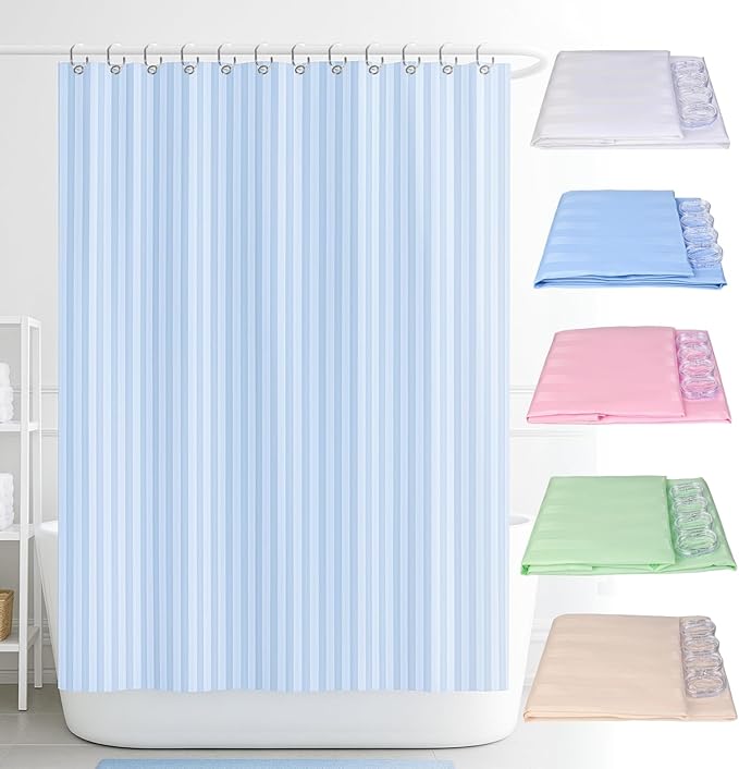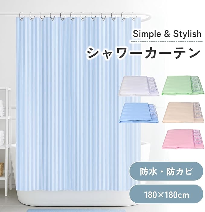 シャワーカーテン 180cm丈 シンプル ストライプ柄 防水 ユニットバス 風呂 バスカーテン (ブルー)