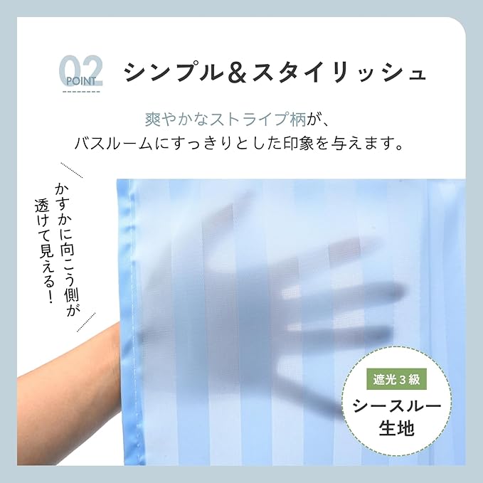 【シンプルでおしゃれなデザイン】シンプルでどこにでも合わせ易い、ストライプ柄のシャワーカーテンです。鮮やかな色で、部屋がパッと明るくなります。向こう側がかすかに見えるシースルー生地を採用(遮光3級)。
