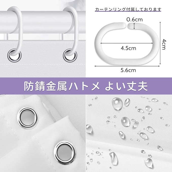 【シャワーカーテン】サイズ180 x 180cm。吊り下げ用のリングが12個付属しており、取り付けが簡単です。標準サイズのストレートおよびカーブしたシャワーロッドに適しています、よく固定できます