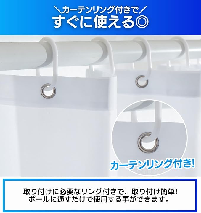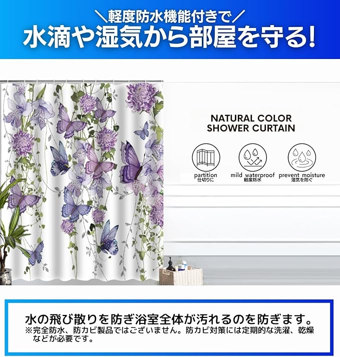 【軽度防水&お手入れ簡単】軽度防水機能付きで、水の飛び散りを防ぐとともに、浴室の湿気を部分的に遮断し、清潔な環境を保ちます。丈夫なポリエステル素材で耐久性も抜群。カーテンリング付きで取り付けも簡単です。洗濯可能なため、汚れてもお手入れが簡単で長期間使用できます。おしゃれで機能的なシャワーカーテンは、家庭用としてだけでなく、賃貸物件やゲストハウスでも重宝します。