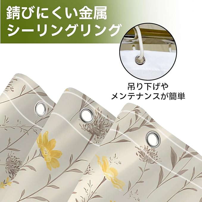 [丈夫で耐久性のある金属ホック設計]: バスカーテンには丈夫で耐久性のある金属ホックが使用されており、使用中にカーテンがしっかりと固定され、外れにくい設計になっています。これにより、製品の寿命が延び、安全性も向上します。
