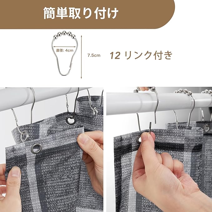 「機能」ポリエステル100%で防水撥水の効果が優れて、入浴時に水しぶきがカーテンから飛び散らないで安心します。速乾性があり、シャワー後の乾きが早くて、衛生的で清潔感に保ちます。耐熱耐久、通気などをしています。夏だろうか冬だろうか、快適に使えることができます。軽くて耐久性があります。