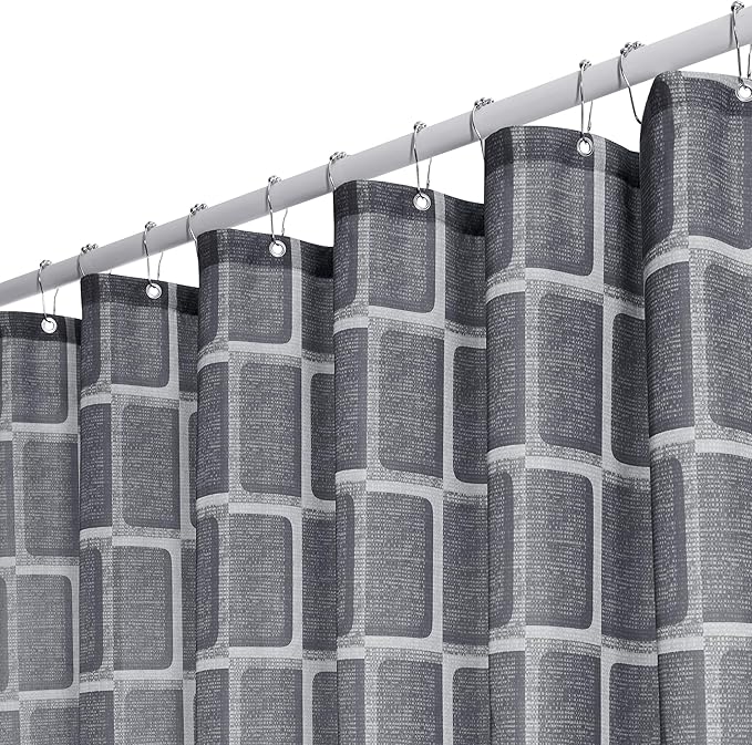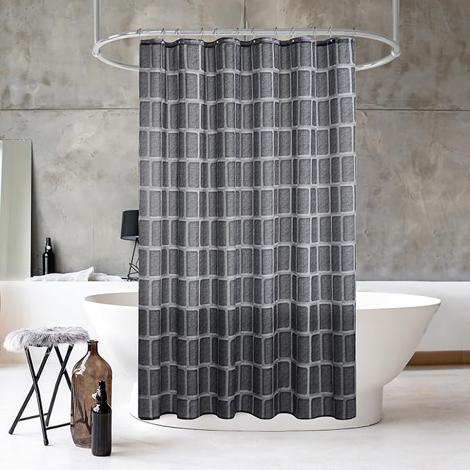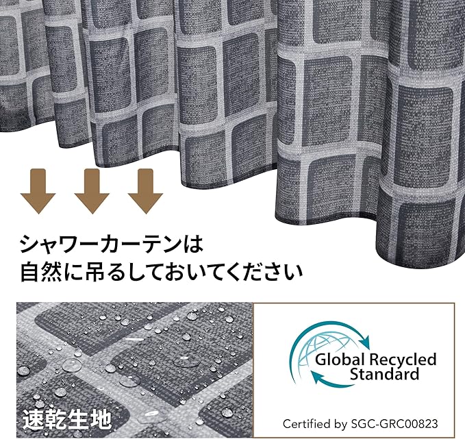 「デザイン」ダーク色のカーテンとブロック柄のデザインは品よくて、人に高級感と安定感を与えます。そういうアーバンスタイルシリーズはすっきりとしたデザインで、あなたの浴室をよりクールな印象に見せることができます。環境にやさしい平織りで作られており、有害物質を含まないで体に影響を与えません。