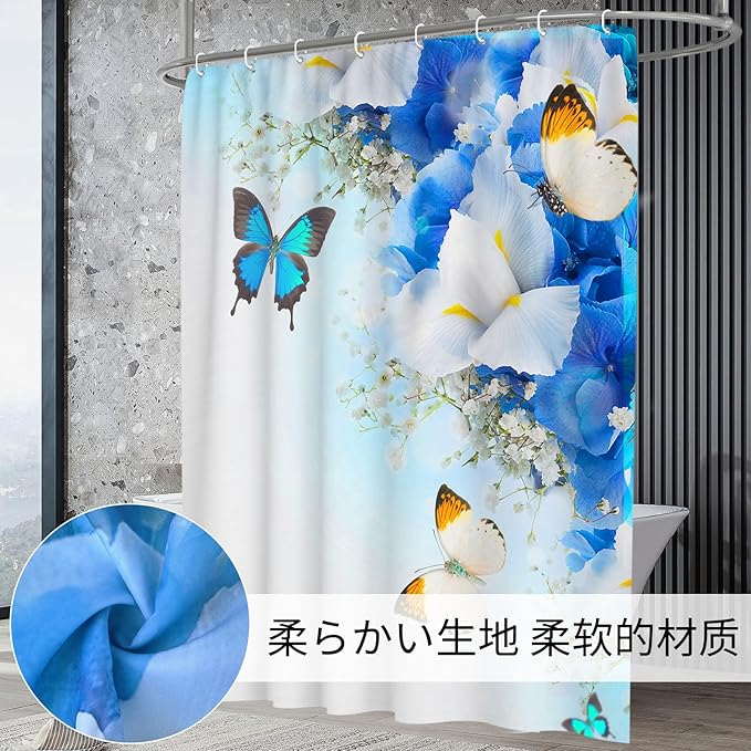 【Seorsok 】 シャワーカーテン 北欧風 防カビ 120 180cm 防水 速乾 お風呂カーテン 緑の葉 青い蝶 花 植物柄 軽量 シンプル ホワイト バス用品 バスルーム おしゃれ 森 山の景色 雪に覆われた木 冬用 間仕切り 12個カーテンリング付き,青い蝶