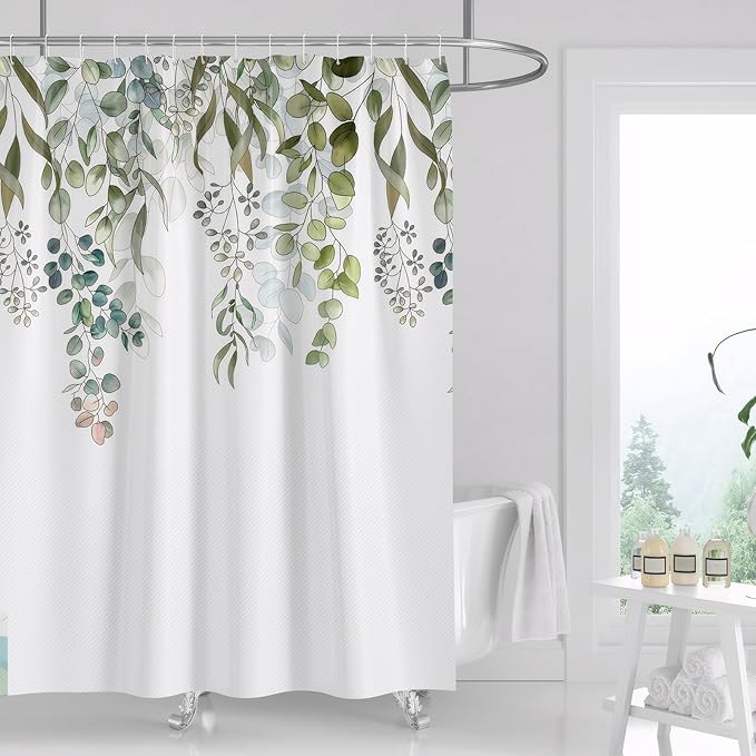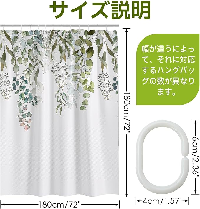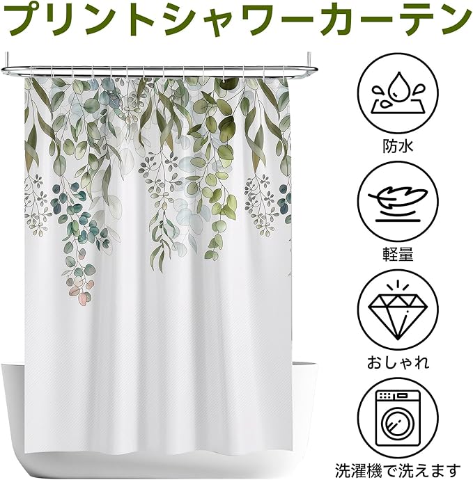 エレガントな緑の葉のデザインが特徴的なこのシャワーカーテンは、バスルームに爽やかな雰囲気をもたらします。繊細な水彩画風の葉のパターンが、まるで自然の中にいるような心地よい空間を演出します。