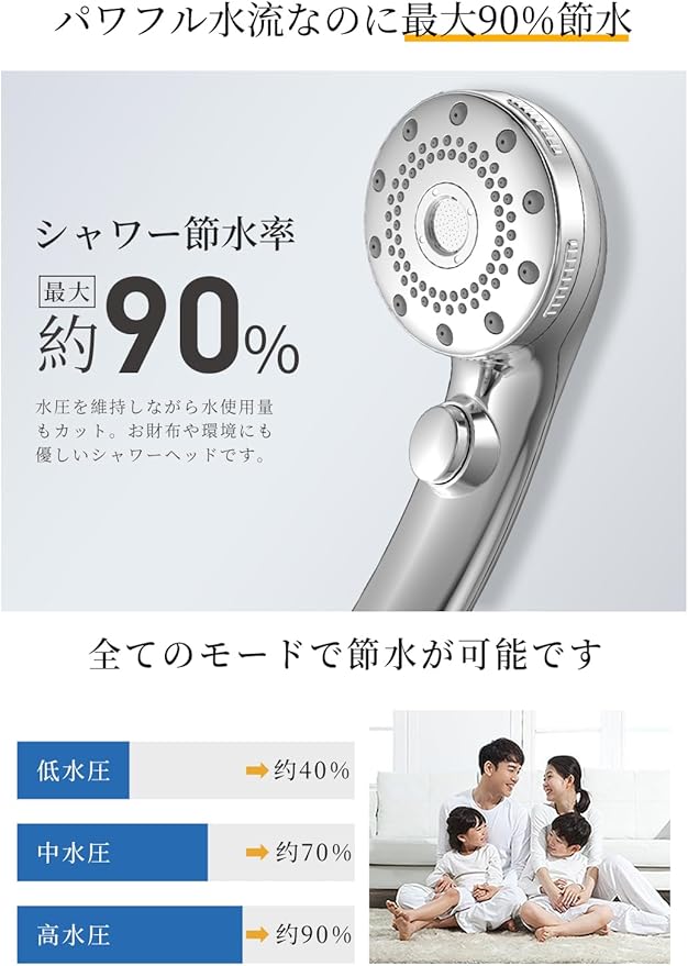 【5段階モード&節水効果】5つのモード切り替えで、目的に応じた最適な水流を提供。低水圧時に約40%、中水圧時に約70%、高水圧時には最大90%の節水を実現。肌にもお財布にも優しい設計です。