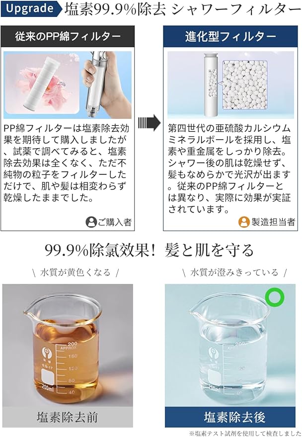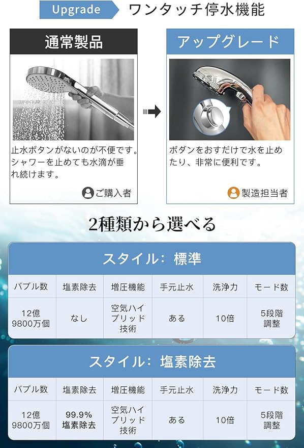 【2種類の選択肢&用途に合わせた機能】塩素除去フィルター付きの『塩素除去』タイプと、シンプルで使いやすい『標準』タイプの2種類をご用意。それぞれのニーズに合わせたシャワー体験をお楽しみいただけます。塩素除去タイプは塩素除去機能で肌や髪にやさしく、より健康的で美しい肌を目指す方にぴったり。標準タイプは軽量かつシンプル設計でどなたにもおすすめです。