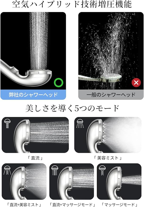 【水圧アップ&快適シャワー】空気力学を活用した独自設計で水圧を強化。高層階や低水圧環境でも安定した水流を提供し、快適な使用感を実現。微細ミストがデリケートな肌をやさしく洗い流します。