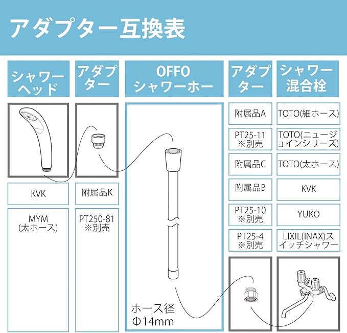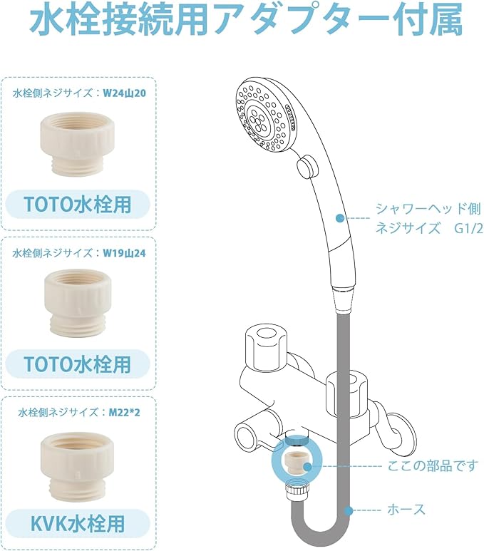[アダプター付属] 混合栓とシャワーほーす接続用のアダプターが付属されております。付属品AはTOTO水栓(細ホース)と接続用です。付属品BはKVK水栓と接続用です。付属品CはTOTO水栓(太ホース)と接続用です。