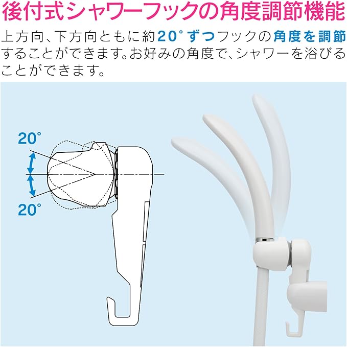 角度調節機能付き(上20度、下20度まで調節可能)なのでシャワーをお好みの角度に調整できます。