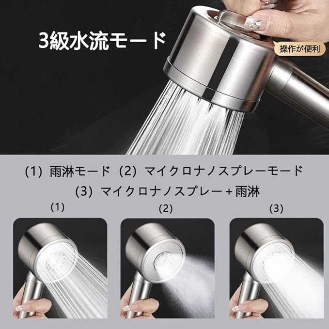 金属シャワーヘッド マイクロナノバブル【新登場 304ステンレス鋼材質】超増圧 高水圧シャワーヘッド3段階モード shower head 節水 極細水流 頭皮に肌に優しい ミスト シャワー 堅固 耐摩耗 たいふしょく 耐用年数が長く 保温 保湿 高洗浄力 汚れ除去 水漏れ防止 アダプター付 取り付け簡単 国際汎用基準 アダプター付き