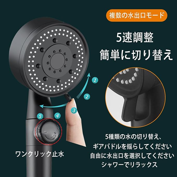 【5段階モード調節】シャワーヘッドは散水板の穴の大きさ、配置、速度などを徹底的に研究して、5種類の出水モードを設計した 霧モード、パルスモード、レインモード①、レインモード②、マウンテンデューモード 自由に調節でき、お風呂体験がより一層リラックス楽しめましょう。