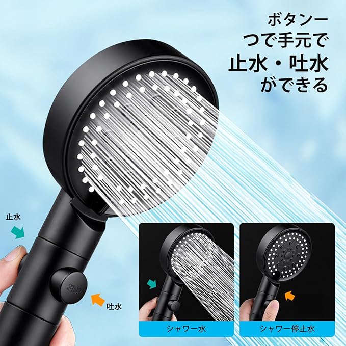 【手元ストップ機能&調整可能な水圧】シャワーハンドルのボタンを押すだけで、ワンクリックで水を止めることができます。操作は簡単で便利です。必要に応じてオンとオフを切り替えることができます。シャワーハンドルのSTOPボタンを回転させ、水圧を自由に調整し、水の流れを合理的に制御することができます。節水を達成して下さい。よりよく節水を達成し、設計は環境保護の概念に合致します