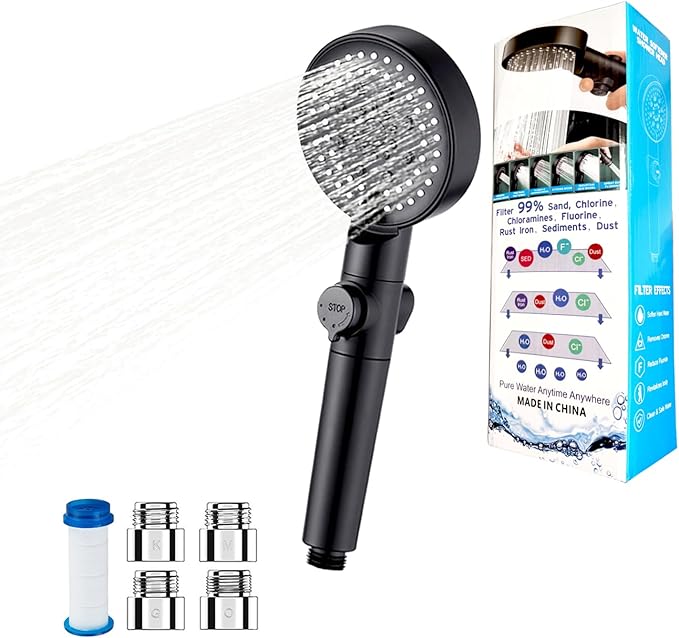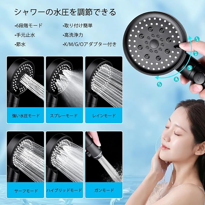 シャワーヘッド 節水シャワーヘッド 高水圧 6段階モード 蓮蓬頭 極細水流 水流調整 回転圧力調節 取付簡単 4種類アダプター付き (M/K/G/O) 汚れ 除去 美肌 保湿 水漏れ防止 軽量 浄水 国際基準G1/2 お風呂用品 (ブラック)