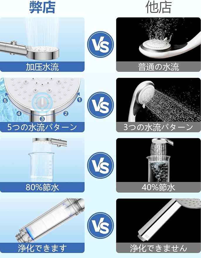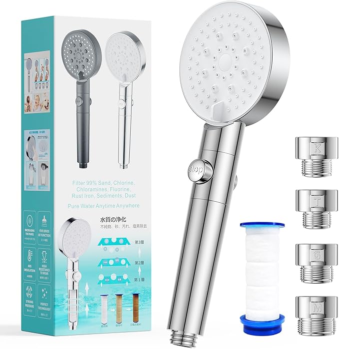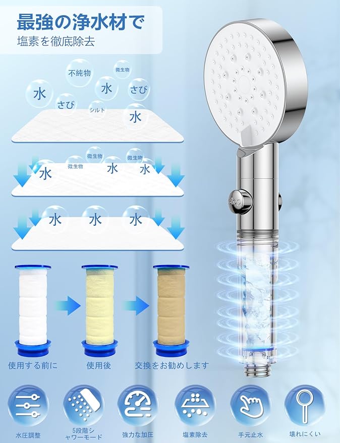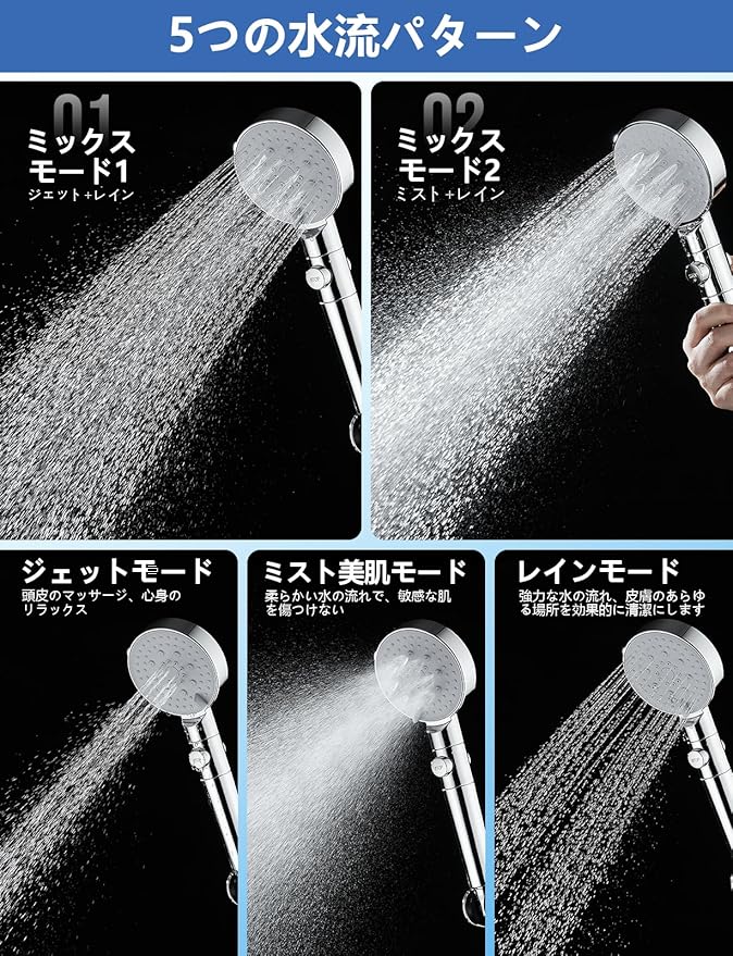 2024新登場 シャワーヘッド 5段階モード 80%節水 ウルトラファインバブル 二重濾過 フィルター 浄水 高洗浄力 増圧 水圧高い 止水ボタン 水漏れ防止 塩素除去 手元止水 ミスト美肌 ジェット レイン ミックス シャワールーム
