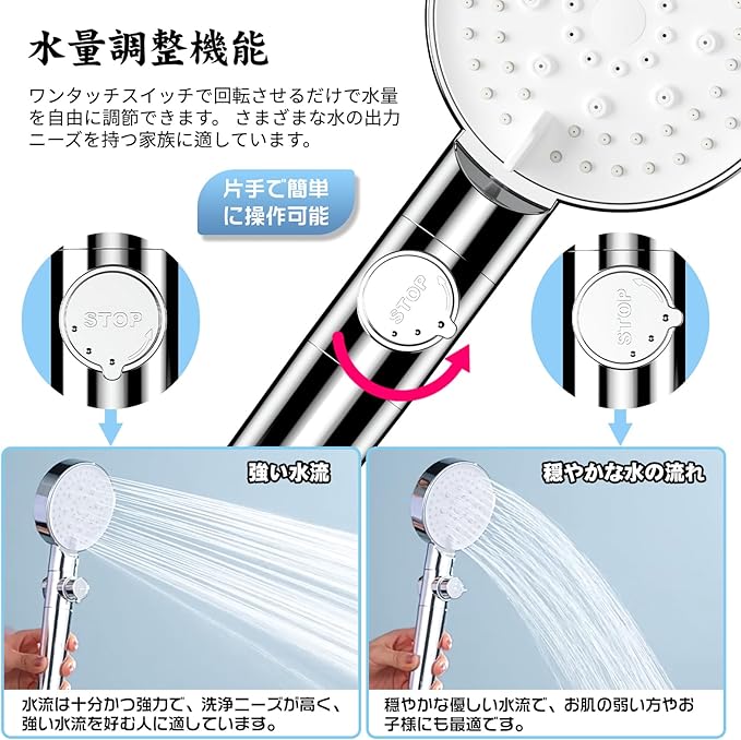 【商品の特長】シャワーヘッドには強い増圧機能がある、少量の水で勢いのある高水圧な水流を実現し、密度高いウォーターパルスを生み出します。効率的に節水とともに、シャワーのニーズをすべて満たせます!シャワー ヘッドは多数個極細穴で構造された、超微細のマイクロナノバブルを作れます。お肌に優しいミスト式は毛穴の黒ずみや皮脂汚れを効果的取り除き、高洗浄力を発揮し、つややかな肌を実現します。肌や髪に優しいしゃわーへっどで、お肌は敏感な方もご安心使用ください。強圧シャワーモード、ミストモード、レインモード、混在モード1及び混在モード2、5種類のシャワーモードがある、ボタンを左右回して簡単に5段階出水モードを切り替えます。また、stopボタンを押すと、手元ですぐに止水できます。超便利!国際汎用基準G1/2インターフェースで、ほどんどのホース種類に対応可能です。4種類のアダプタ(M/K/G/O)が付き、自宅のシャワーヘッド規格によって簡単に取付けられます。