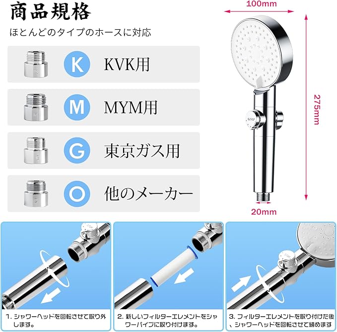 商品仕様:シャワーヘッド本体*1、取り付けアダプター*4個、浄水カートリッジ*2、日本語説明も付きます。ご注意:シャワーホースと接続の時にはアダプター必要な場合は、対応なメーカーさんのアダプターを使用ください。(M→MYM用 G→東京ガス用 K→KVK用 O→規格M24*1.5mmの製品用)