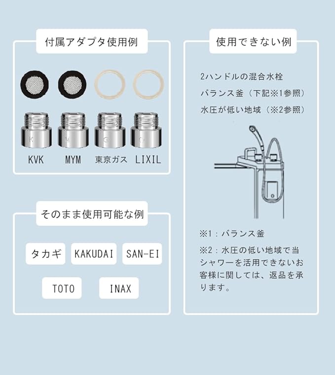 ✅超節水型で水道代+ガス代を年間数万円ほど節約することができます。 ◇多くの水道設備にジョイントできるよう国際基準G1/2アダプター付で、1分で設置可能。ほんの一部ですがバランス釜/逆止弁がない2ハンドル混合栓には取り付けできません。ご容赦下さい。