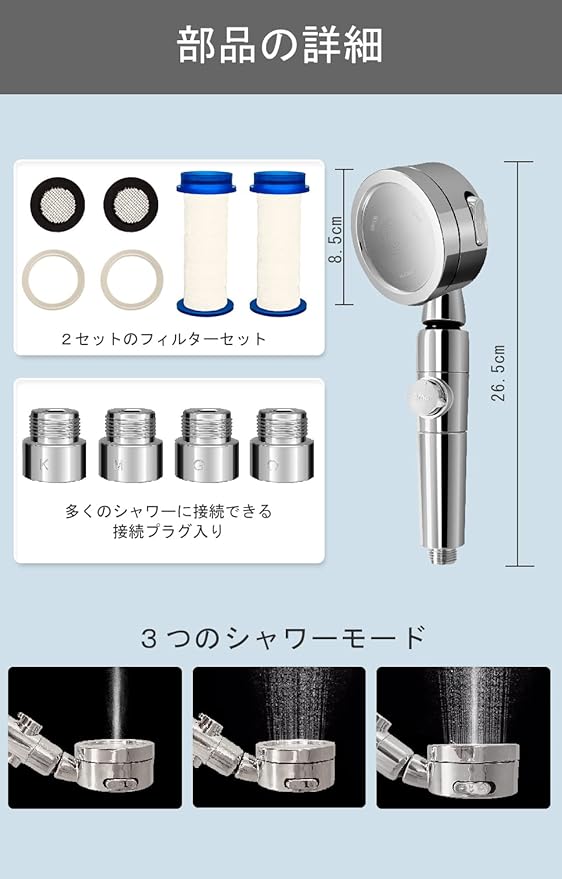 ✅Life.upが提供する最新シャワーヘッド。 ◇極細水流が優しい肌ざわりを実現し、快適なシャワー体験を実現します。 ✅超節水型で水道代+ガス代を年間数万円ほど節約することができます。 ◇多くの水道設備にジョイントできるよう国際基準G1/2アダプター付で、1分で設置可能。ほんの一部ですがバランス釜/逆止弁がない2ハンドル混合栓には取り付けできません。ご容赦下さい。 ✅ヘッドは高級感のある鏡面仕上げで、前後左右へ自在に動かすことができ、あなたのベストポジションを獲得することができます。 ◇ワンストップで止水できるボタンも採用。またシャワータイプも3段階で変化可能。 ✅本製品には不繊維フィルターが付属しており不純物や残留塩素の除去をサポートします。交換の目処はおおよそ3ヶ月です。2つ追加フィルターを同封してあります。 ✅超節水タイプですので最初のシャワー使用時にお湯が出るまで若干時間を要しますが、給湯器・エコキュートの故障ではございませんのでご了承願います。
