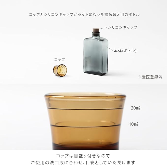MOUTH WASH BOTTLE 見せて置けるマウスウォッシュボトル。 コップとシリコンキャップがセットになった詰め替え用のボトル。 コップには10㎖ / 20㎖のメモリ付き。 容量は400㎖。 attention ・完全密封ではございません。 ・コップや栓は、本体に被せることができますが、固定はされませんので扱いにはご注意ください。