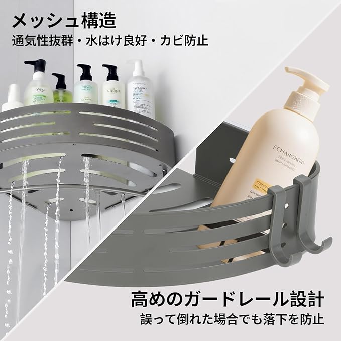 【清潔を保つ通気設計】本品の浴室用ラックは通気性抜群のメッシュ構造を採用。水分がすぐに乾くため、カビや雑菌の繁殖を抑え、シャンプーや石鹸を清潔に保ちます。ジメジメしがちなお風呂の環境をサラッと快適にし、衛生的な収納を叶える理想的なバスルームラックです。