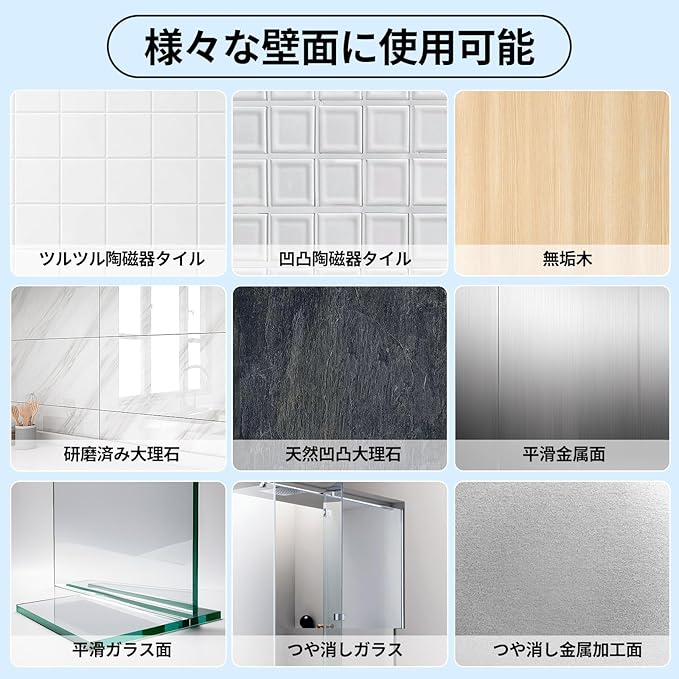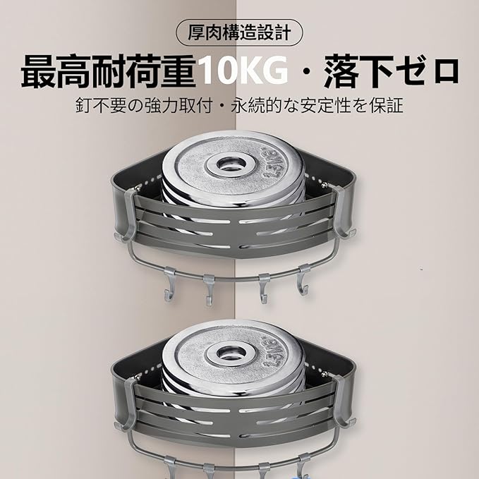 【10kg耐荷重でしっかり収納】強力粘着パネルと補強プレートで、石膏ボードの壁にも驚異の接着力を発揮。最大10kgまでの耐荷重を実現したので、重いシャンプー置き台としても、石鹸置きや洗顔料などたくさんのアイテムをまとめて収納しても、落下の心配がありません。