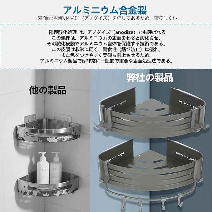 【穴あけ不要で簡単設置】面倒な穴あけ不要で、ドリルを使わずに簡単に設置できる壁掛け式。粘着式なので、バスルームや洗面所のタイルや凹凸のある壁にも対応可能。コーナーラックとして、理想の場所にすぐに設置して活用できます。