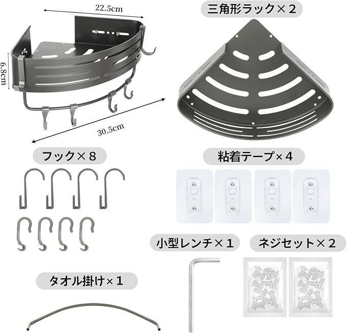 ohbien 浴室用ラック 2段式 強力粘着固定 バスルーム シャワーフック 壁掛け式 コーナー ラック フック8個 お風呂 三角コーナー 収納 風呂場 洗面所 水切り 穴あけ不要 グレー