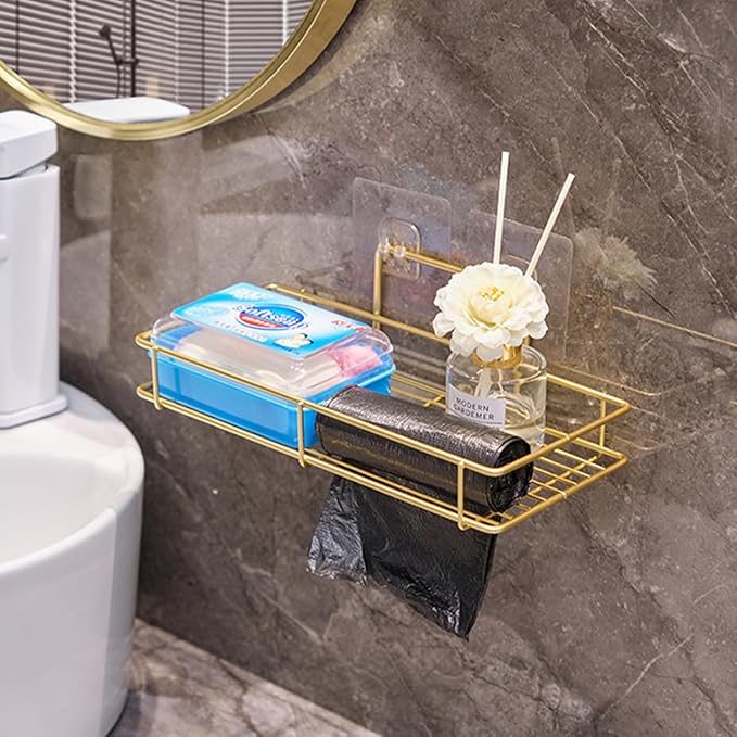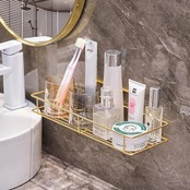 このゴールドのラックは、洗面所やバスルーム、キッチンに最適な収納アイテムです。大小2個セットでさまざまな使い方ができます。穴あけ不要で、取り付けが簡単な粘着シートが付属しています。高級感のあるデザインで、様々なアイテムをスタイリッシュに収納できます。