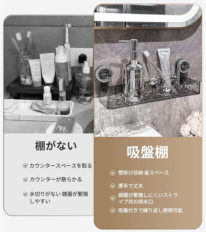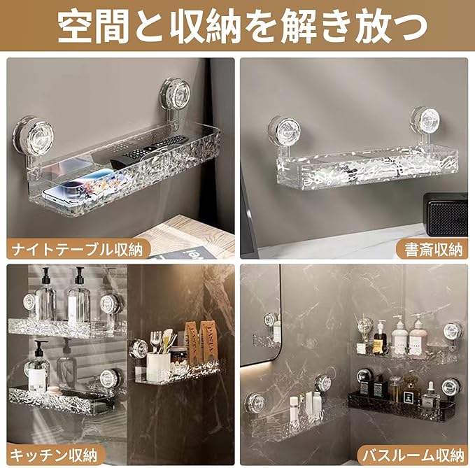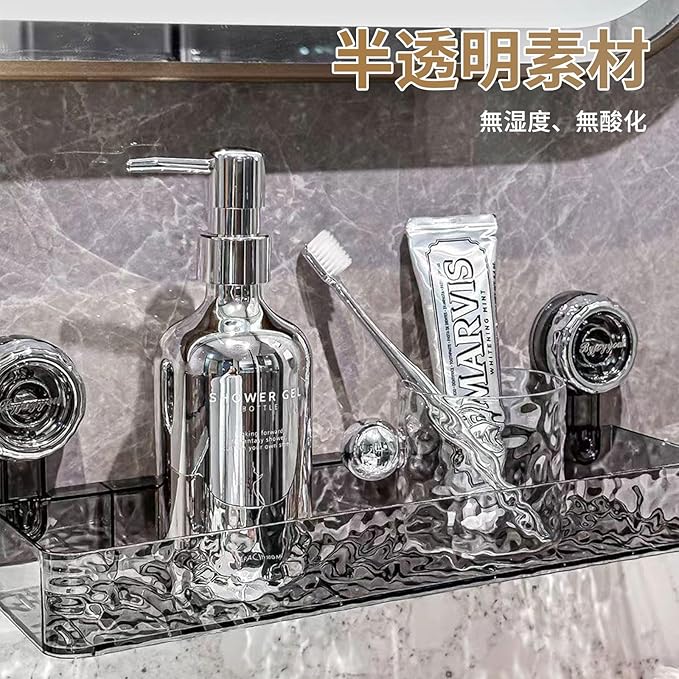 【耐久性抜群!安定の吸着力】高品質素材と強力吸盤の組み合わせにより、長時間の使用にも耐えるしっかりとした構造。重さのあるボトル類も安定して収納可能です。