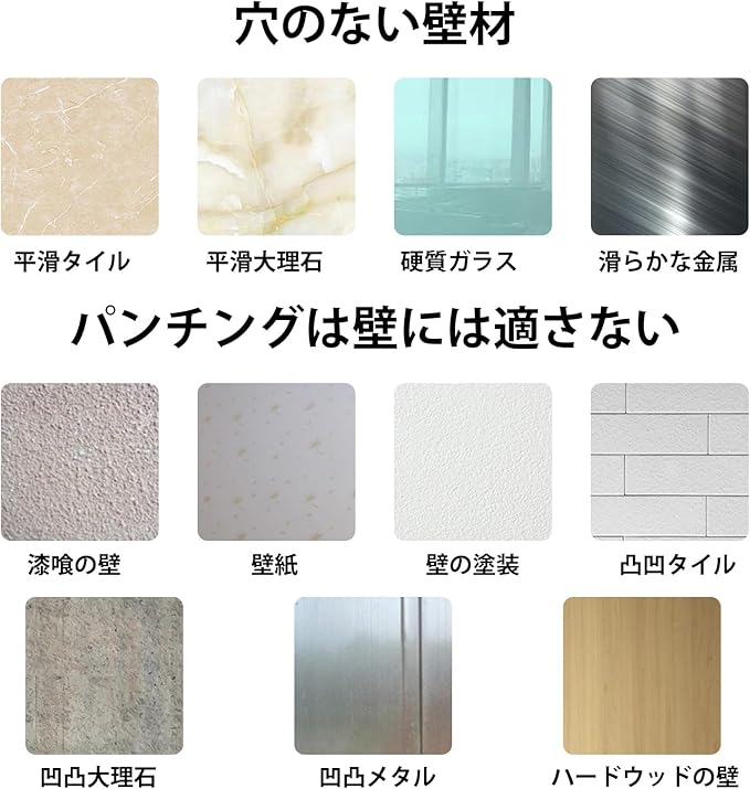 【適用表面】粘着フックは、滑らかなタイル、滑らかな大理石、滑らかな硬質ガラス、滑らかな金属表面に適しています。つや消しタイル、凹凸タイル、漆喰壁、レンガ壁、木壁、塗装壁、壁紙表面には適していません。