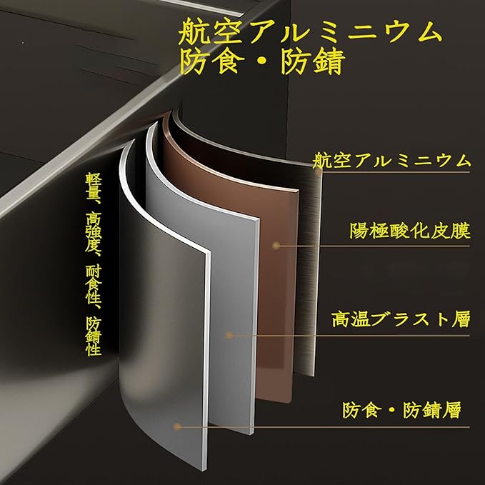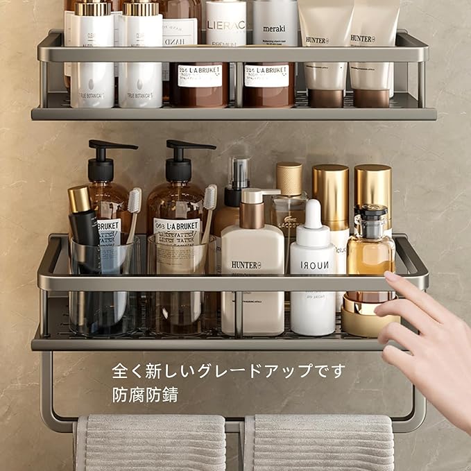 バススタンドはアルミニウムとマグネシウムの合金材料を採用して、軽くて、防腐と錆、酸化と破裂を防止します。湿ったお風呂場や、油汚れのあるキッチンで使っても、ツヤが保たれ、洗いやすく、水がつきにくいです。