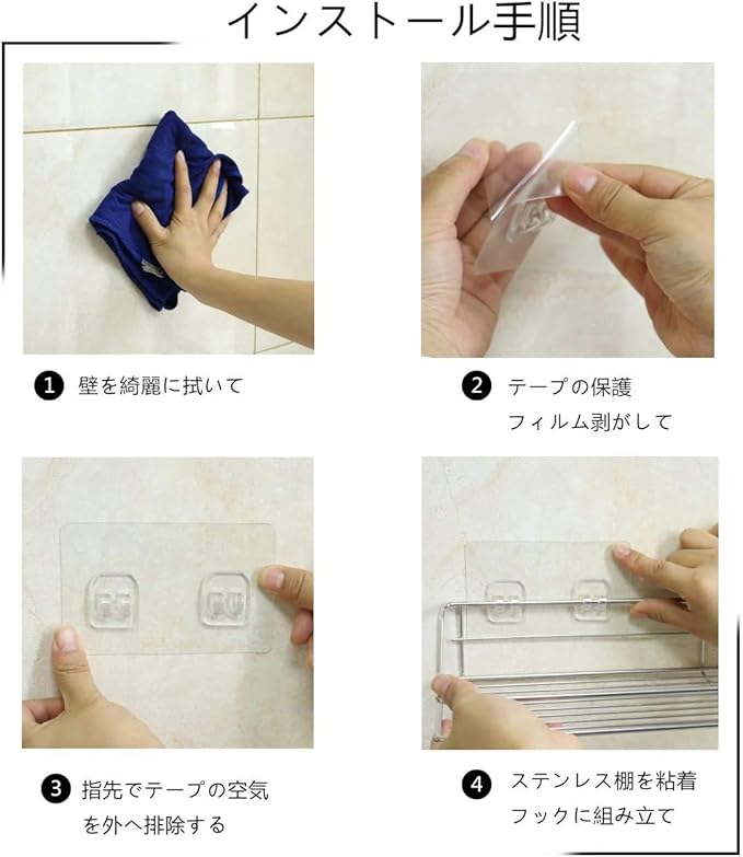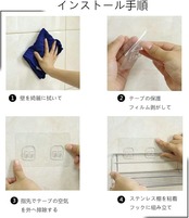 【粘着固定】付着力が強くて、設置しやすい:ナノ材料を採用し、付着力が強いです。穴をあける必要はなく、壁面も壊しません。粘着テープを表面で貼るだけ、その後、浴室収納ラックをテープの上に設置すれば丈夫になります。もし収納ラックを移動したければ、新しい粘着テープを使用してください。