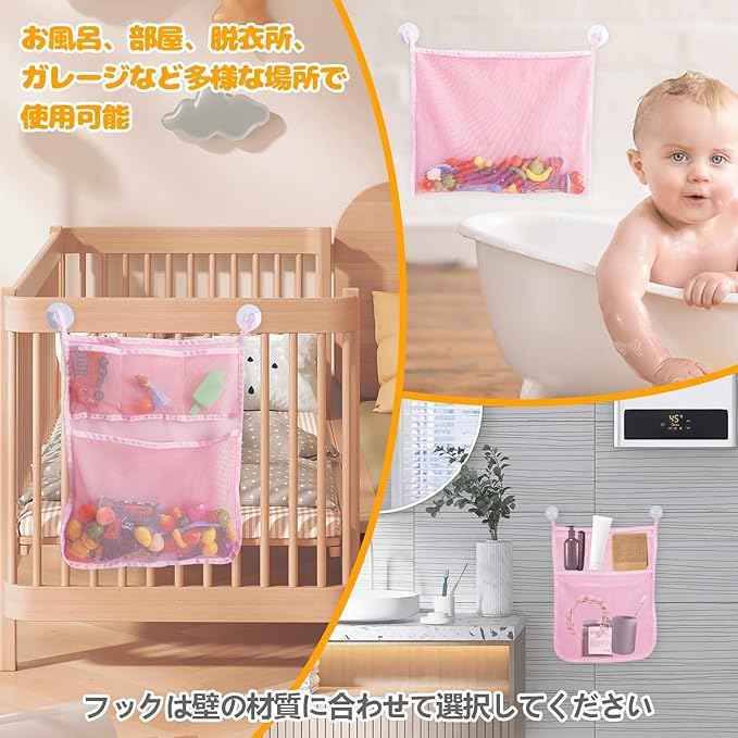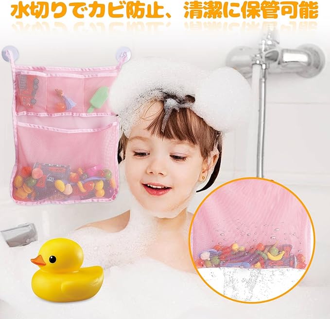 【2個セット】お風呂おもちゃ収納ネット 吸盤フック付き バスルーム用 子供用おもちゃ整理バッグ メッシュ素材 衛生的 (ピンク)
