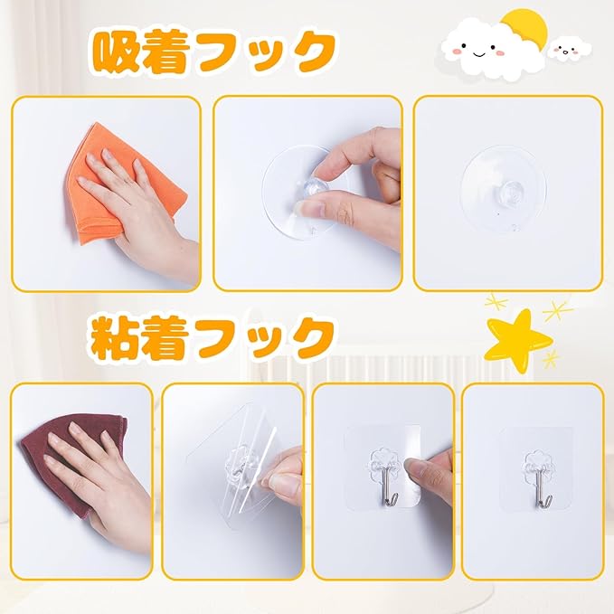 吸盤付きフック設計:、お風呂の壁やタイルに簡単に取り付け可能。