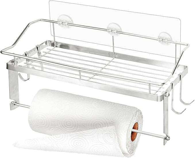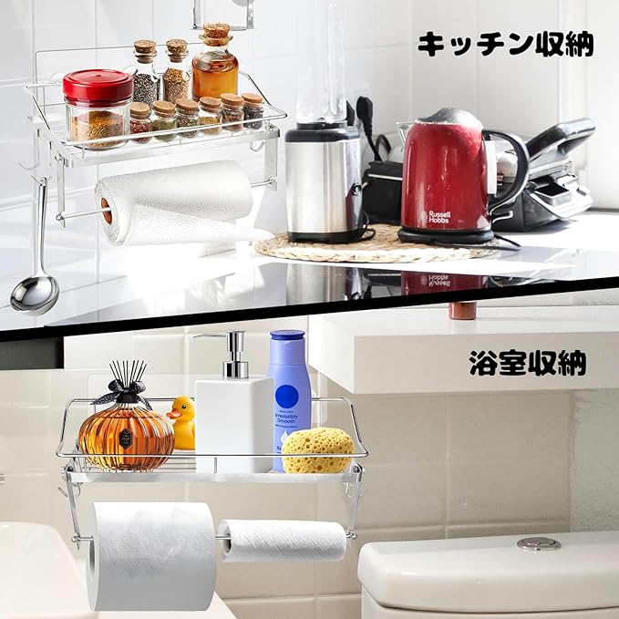 Socpuro 浴室用ラック 壁掛け タオル ペーパーハンガー付き ステンレス 強力粘着式 耐荷重5㎏ 洗面所収納ラック 穴あけ不要 フック4枚&タオルバー付 お風呂 収納ラック 洗面所 バスルーム キッチン収納 調味料ラック 水切りラック
