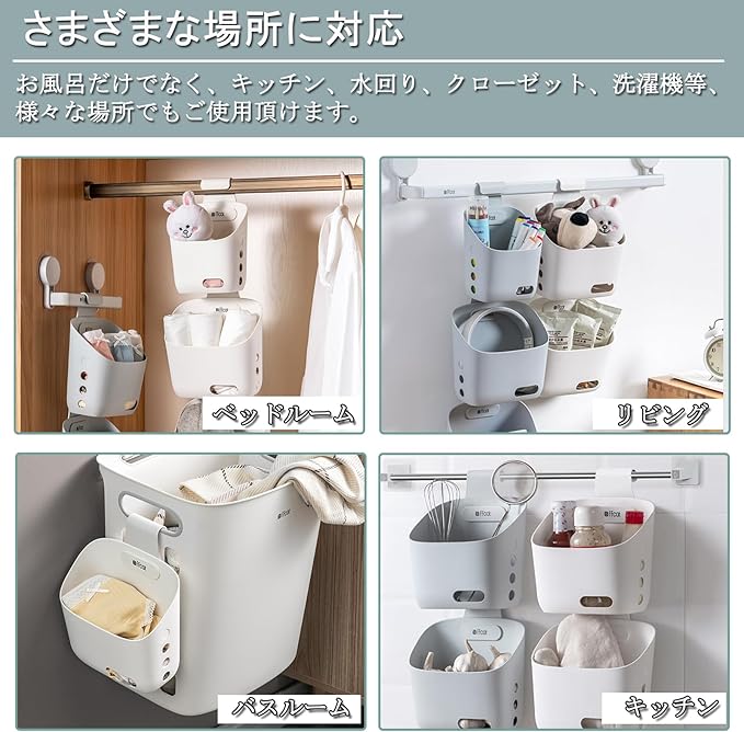 【スペースを節約】引っ掛けて使用できるバスケット。連結してのご使用も可能です。タオルバー、浴室扉のハンドルになどに引っ掛けたり、限られたスペースを有効活用できます。