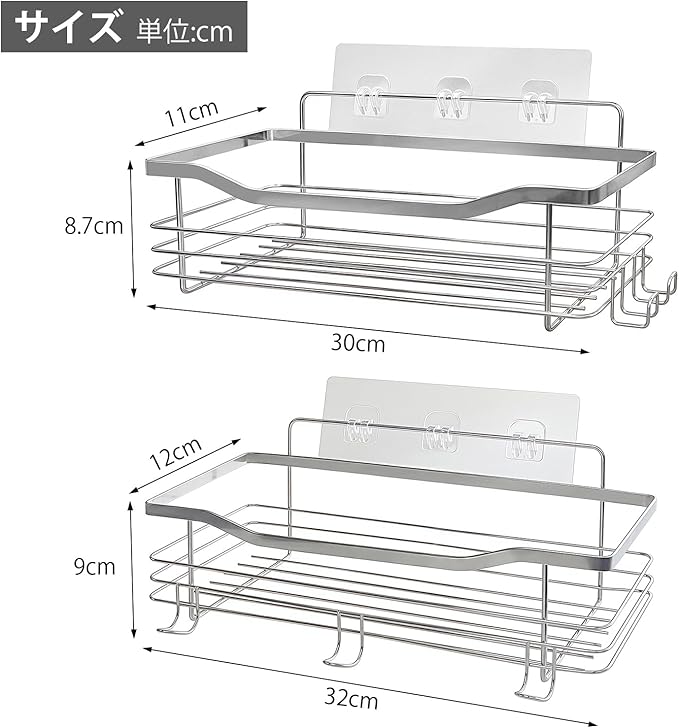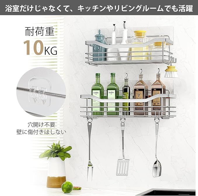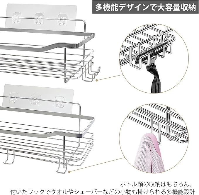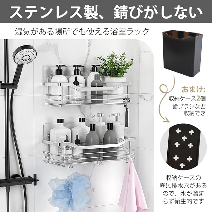 浴室ラック バスルーム ラック フック5個付き ステンレス製 水切り 防水 防錆 防カビ 強力固定 シャワーラック シャンプーラック 水切り キッチン 風呂場 洗面所 壁掛け棚 収納ラック 2セット