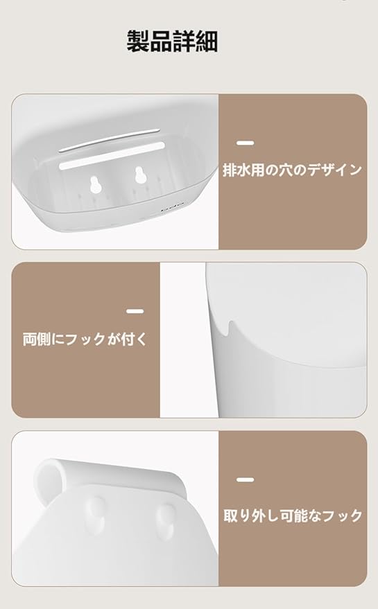 【 さまざまな場所に対応 】お風呂だけでなく、キッチン、水回り、クローゼット、洗濯機、また、リビング、クローゼットの中、玄関に設置してもいいです。ペン、メガネ、おもちゃ、携帯電話、ヘッドホン、計算機、文具、ティッシュ、お菓子、シャンプー、ボディーソープ、化粧品などの小物を整理するのに適しています。
